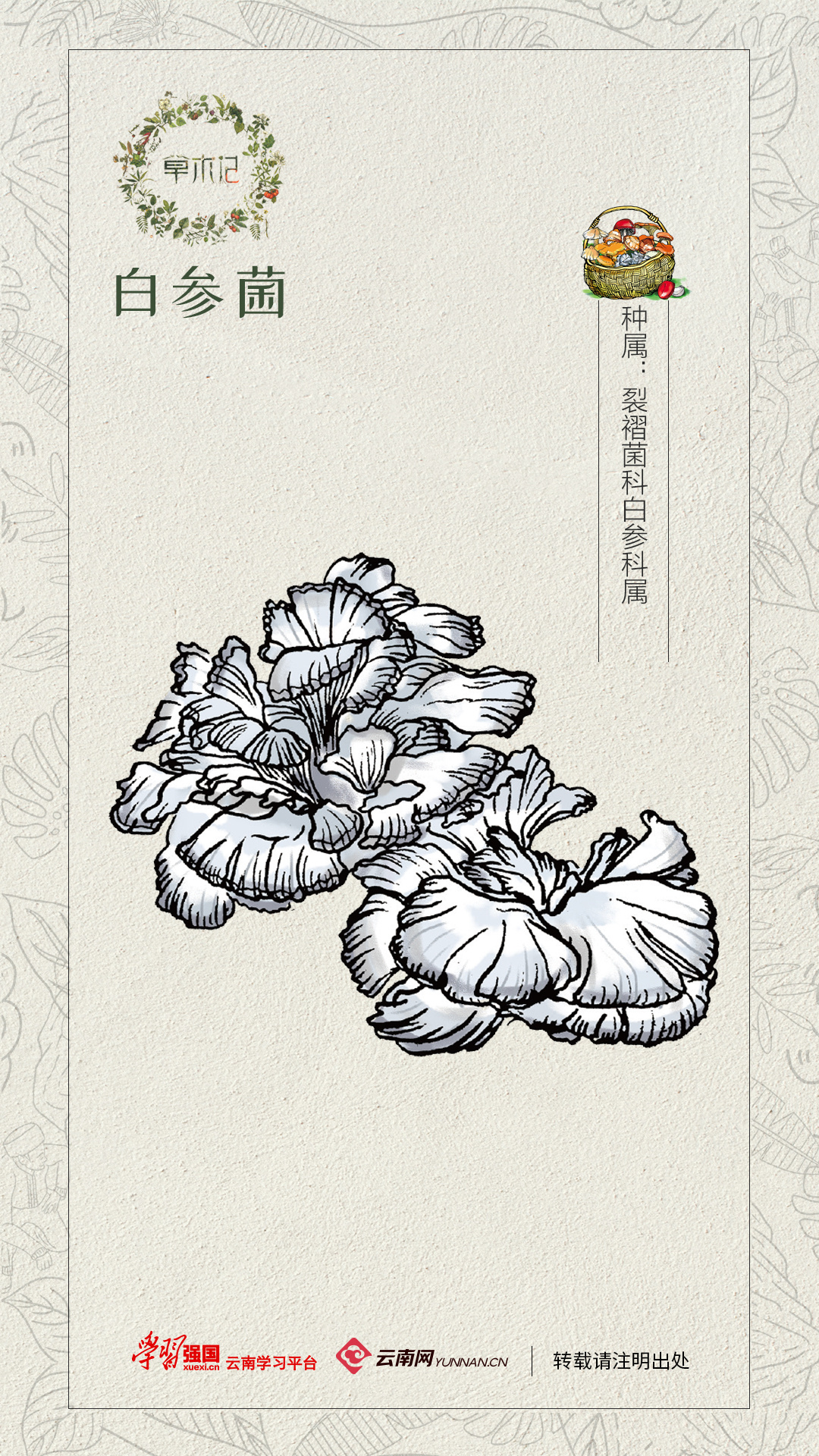 转眼已为人母的姐姐和我,也开始关注孩子成长,关注各种食物的营养搭配,才发现白参菌又名裂褶菌、白花,是一种食药兼用的珍稀菇菌,含有人体必需的八种氨基酸,且富含锌、铁、钾、钙、磷、硒、锗,有着较高的药用价值。现在,无论在姐姐家还是我们的小家里,无论菜谱怎样变化,只要在白参菌上市的季节里,都会给自己孩子加上一碗白参炖鸡蛋,女儿第一次新奇地看着白参菌,好像发现新大陆似的说:“妈妈、妈妈,快看!它好像一把小扇子呀!”我微微一笑,仿佛看到了自己的童年……看着孩子大口大口地吃着自己做的白参炖鸡蛋,一天天健康快乐地成长,作为母亲的我越能领会这其中更是一份爱的延续。