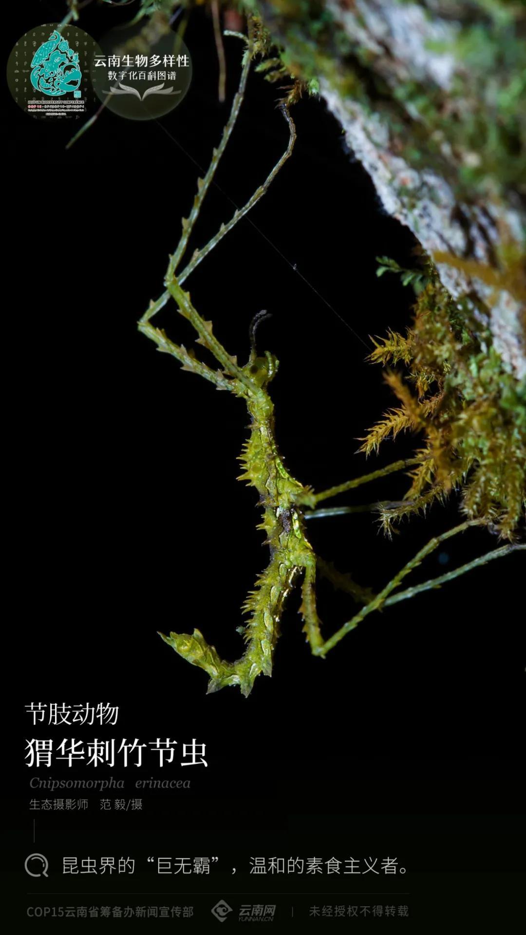 猬华刺竹节虫,隶属节肢动物,昆虫纲,竹节虫目,竹节虫科。多生活在温度和湿度较高的阔叶林区,照片摄于云南省红河哈尼族彝族自治州屏边苗族自治县。