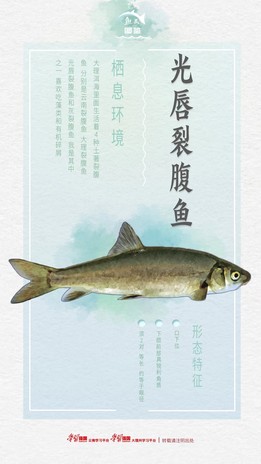 即日起,“学习强国”云南学习平台、昭通学习平台、昆明学习平台、红河州学习平台、大理州学习平台、丽江学习平台联合推出“鱼类图鉴”系列策划,邀您一起畅游水底世界,探寻水中奥秘,听水中精灵讲述精彩故事。