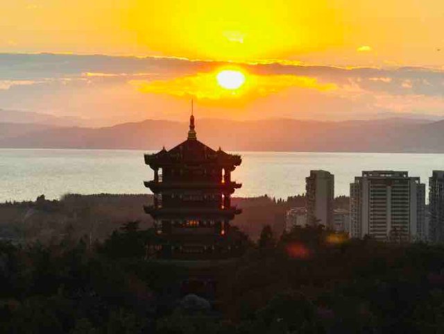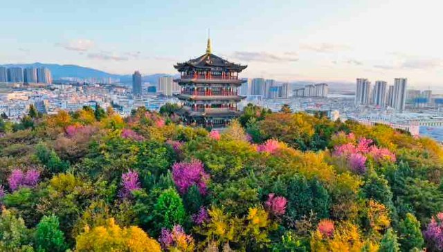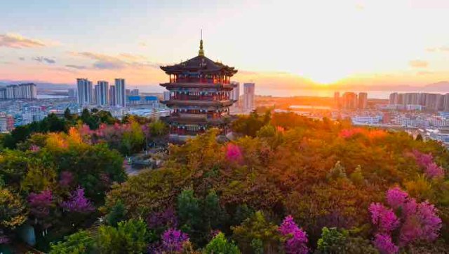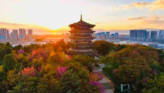 三台山曾被誉为“凤岭松峦”,是呈贡著名的“十六景”之一。明代哲学家李贽任云南姚安县知府期间曾登顶三台山,远望滇池留下了“一览观沧海,三台子草亭”的佳句。现如今,三台山公园里的东骧阁被樱花包围,可登上阁楼登高望远,看看满山遍野的冬樱花;亦可在满园葱郁间远眺滇池全貌、西山睡美人的风姿。
